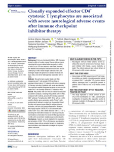 | Title: | Clonally expanded effector CD4(+) cytotoxic T lymphocytes are associated with severe neurological adverse events after immune checkpoint inhibitor therapy |